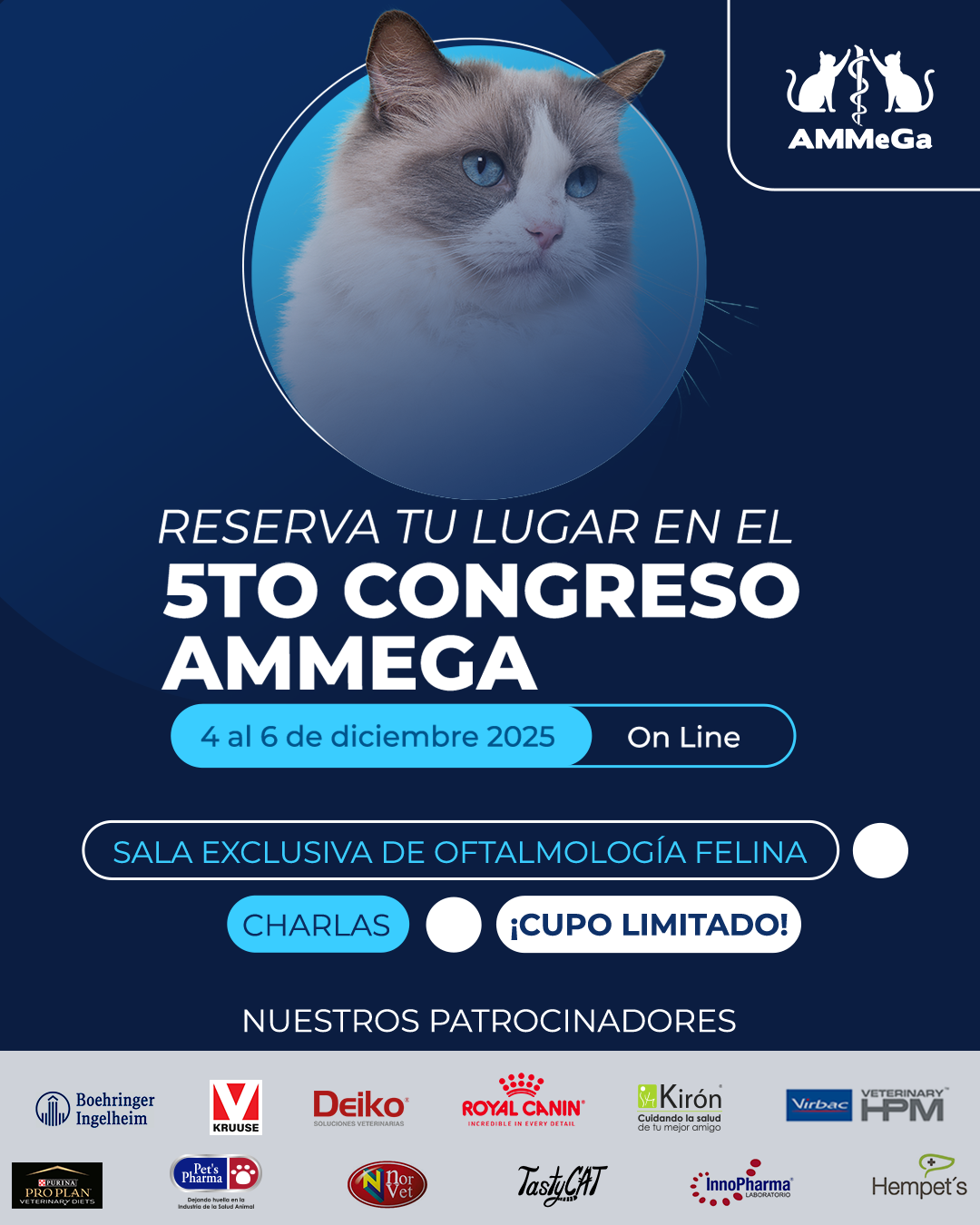 Evento Online 5to Congreso AMMeGa 2025 Tema: Oftalmología Felina Fechas y Horarios: 4, 5 y 6 de diciembre, 2025 Horarios: Jueves 4 y viernes 5 De 9 am a 7:30